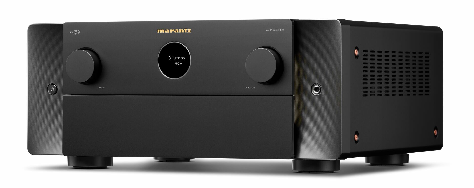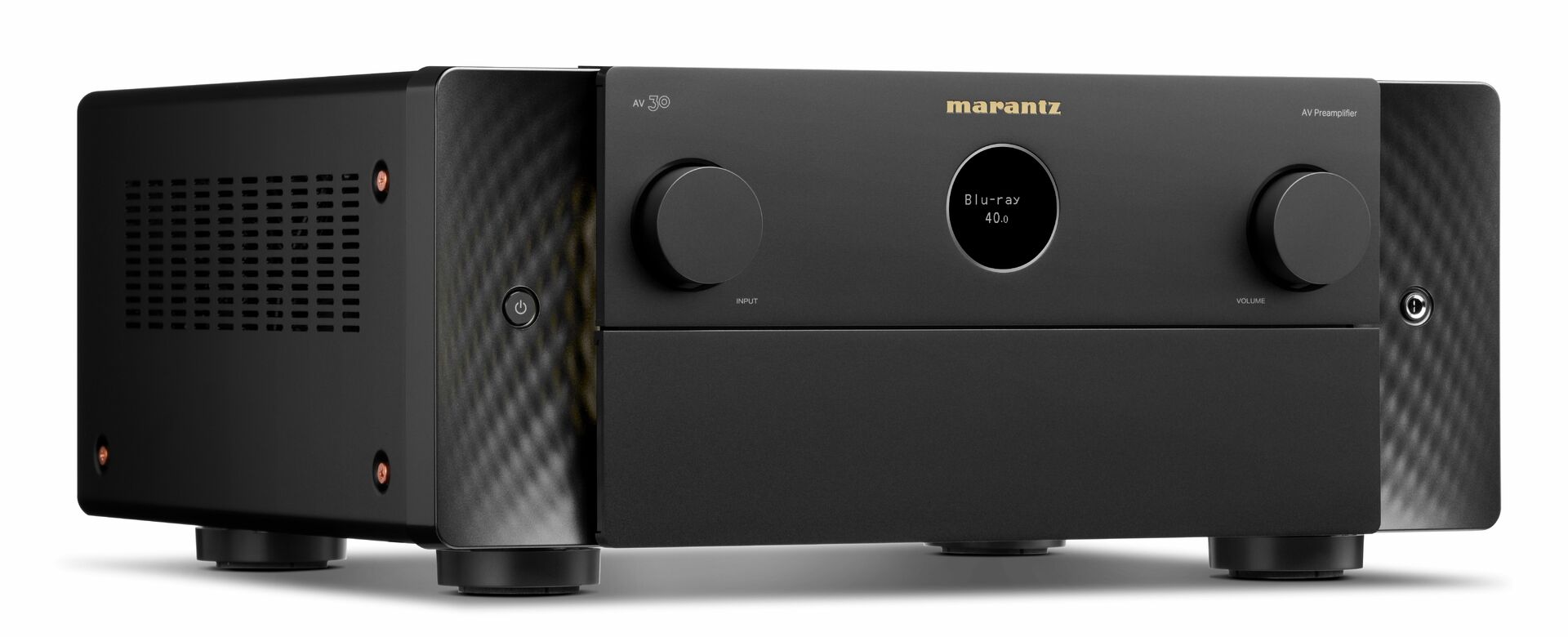 AV 30, moderní vyjádření nadčasových designových principů, se vyznačuje ikonickým okénkem Marantz, prémiovými materiály a jemným bočním osvětlením, které osvětluje přední panel.