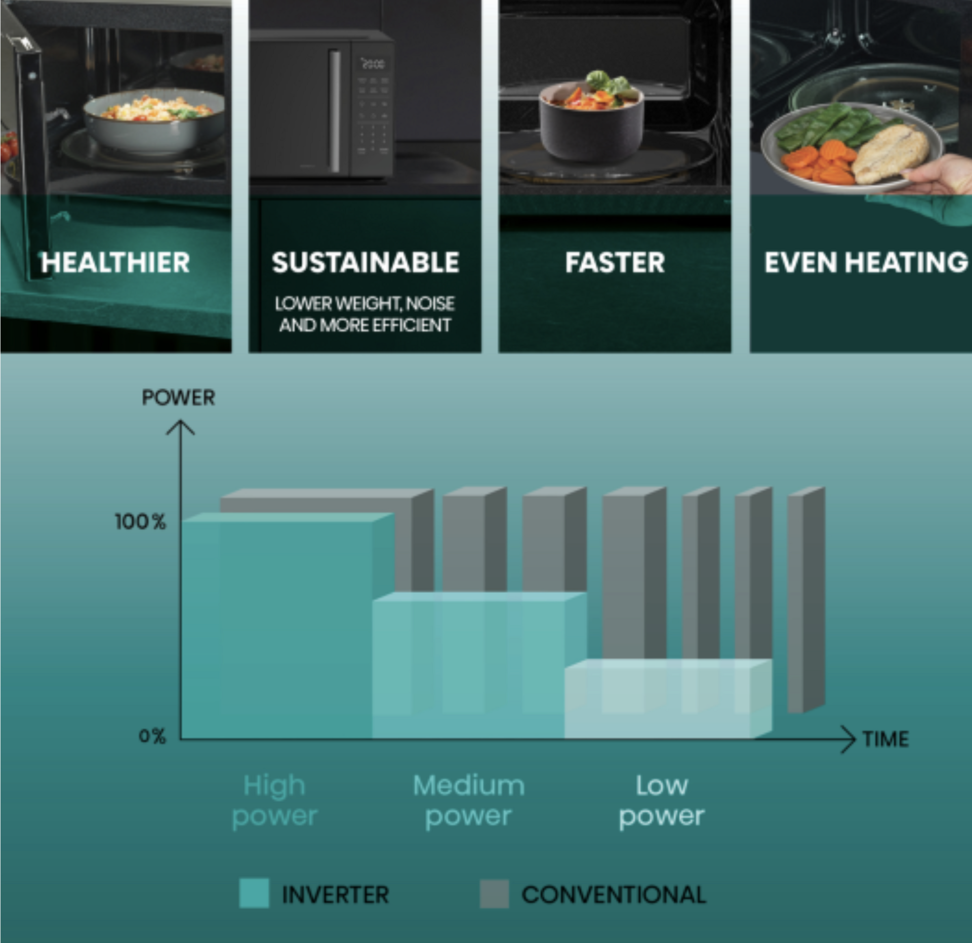 Nejmodernější technologie invertoru pro mikrovlnné trouby Hisense změní způsob přípravy jídla. Vychutnejte si rovnoměrně připravené a chutné pokrmy a zároveň ušetřete čas, peníze i energii. Doba vaření je kratší a jídla chutnají ještě lépe. Vylepšete svou kuchyni invertorovou technologií Hisense a dosáhněte ideální kombinace energetické účinnosti, přesnosti a chuti.