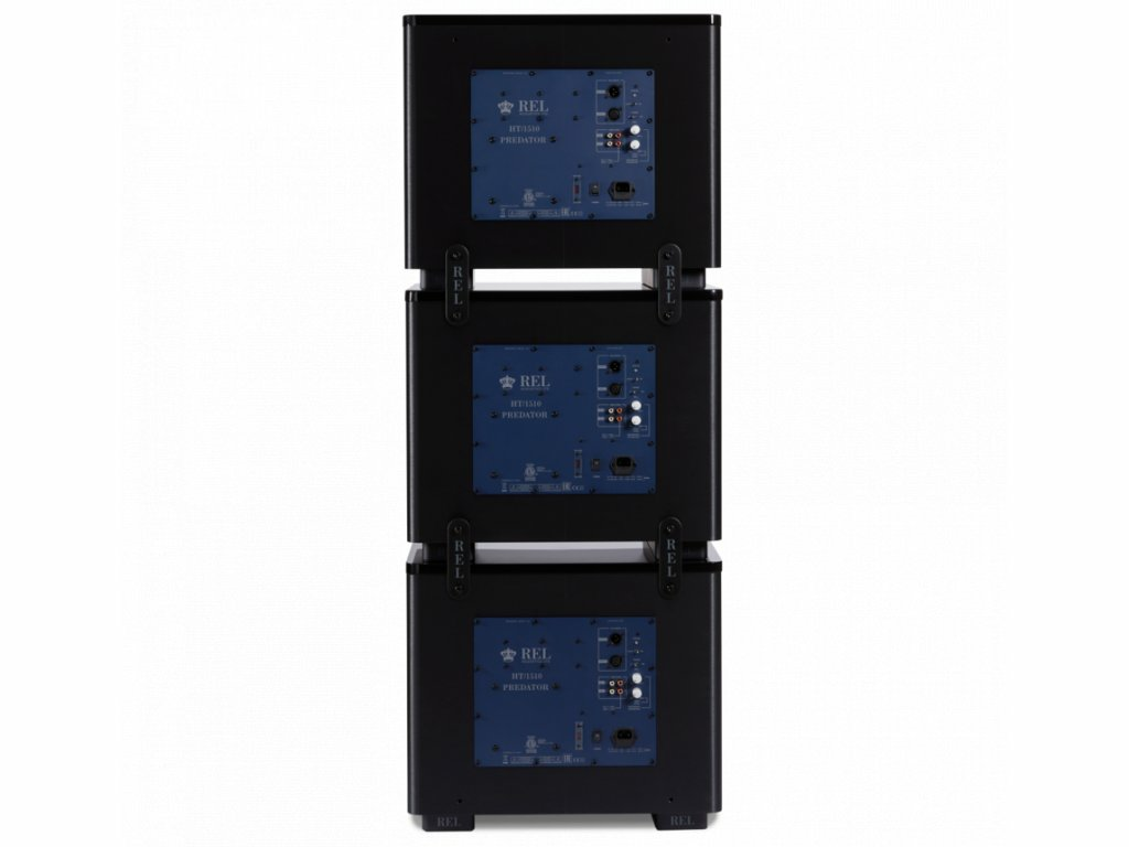 HT/1510 Predator nabízí ještě jednu unikátní inovaci REL. Pro skutečně špičkový výkon jsou Predators navrženy tak, aby mohly být stohovány až do výšky tří (3) jednotek pomocí přiložených REL Couplers™, které spojují spodní jednotky s horními. Tyto pevné, frézované hliníkové spojky jsou bezpečně přišroubovány ke každému subwooferu a spolu s masivními kolejnicemi na spodní straně každé skříně vytvářejí extrémně těžkou a robustní basovou věž. Při použití ve stereo sestavách (celkem 6, 3 na stranu) představuje více než 8000 wattů špičkového výkonu (6) x 15” měničů, aby poskytly maximum ve službách úchvatných basů dodávaných v oceánských proudech basů.
